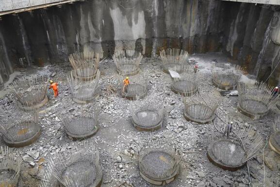 8月24日,繼龍巖大道高架橋主橋主塔樁基、承臺(tái)基坑開挖完成后,項(xiàng)目已進(jìn)入主塔承臺(tái)施工階段,主橋封底混凝土澆筑完成0.75米(共1.5米),主橋轉(zhuǎn)體關(guān)鍵設(shè)備鑄鋼球鉸已生產(chǎn)完成,現(xiàn)場(chǎng)正進(jìn)行樁頭破除作業(yè)。由于連續(xù)橫跨贛龍鐵路、龍廈鐵路、羅龍東路、龍津河、雙洋路,主橋采用不對(duì)稱跨塔梁同時(shí)轉(zhuǎn)體施工,其轉(zhuǎn)體總重達(dá)2.366萬噸,轉(zhuǎn)體懸臂173.75m,施工難度巨大。為避免對(duì)城市道路及鐵路運(yùn)行的影響,主橋?qū)⒉捎貌粚?duì)稱跨塔梁施工并分二次轉(zhuǎn)體,下一步進(jìn)行控制性工程為兩次主塔轉(zhuǎn)體施工。