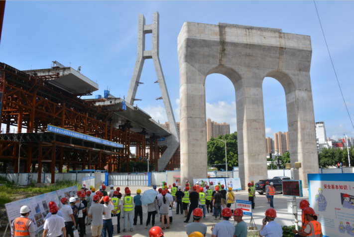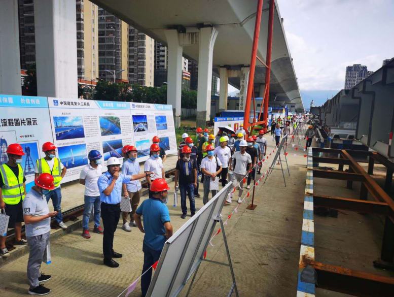 2020年6月28日,由龍巖城市發(fā)展集團(tuán)有限公司主辦,龍巖市政建設(shè)集團(tuán)有限公司(市城投公司)承辦,北京鐵研建設(shè)監(jiān)理有限公司、中國(guó)建筑第六工程局有限公司、中冶(上海)鋼結(jié)構(gòu)科技有限公司協(xié)辦的龍巖大道高架橋項(xiàng)目質(zhì)量安全標(biāo)準(zhǔn)化觀摩會(huì)在龍巖大道高架橋主橋鋼箱梁工程現(xiàn)場(chǎng)舉行。觀摩會(huì)分拼裝區(qū)域、提升站區(qū)域、頂推滑移區(qū)域、步履滑移區(qū)域及主橋轉(zhuǎn)體區(qū)域分別展示了龍巖大橋主橋鋼結(jié)構(gòu)拼裝、提升、弧形頂推滑移、步履滑移等新工藝及主塔“水平二次轉(zhuǎn)體”、鋼箱梁頂推、斜拉索施工技術(shù)。