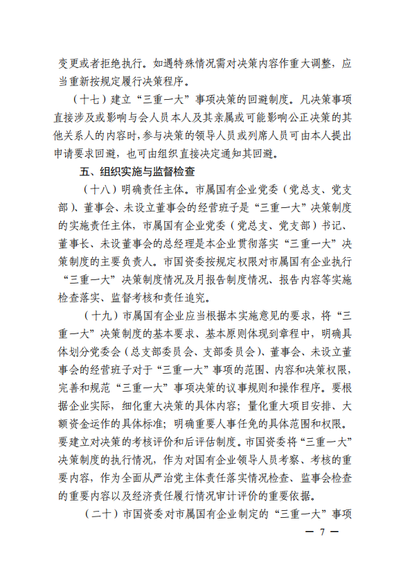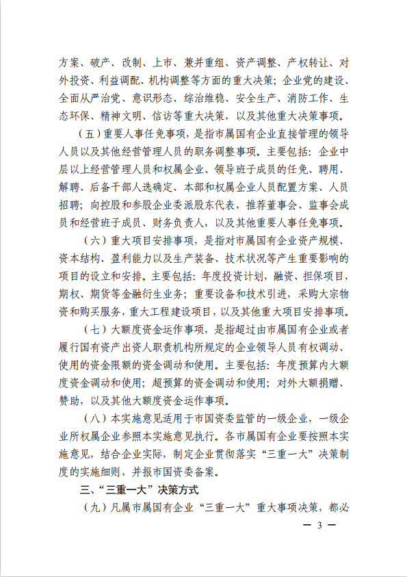 關(guān)于進(jìn)一步規(guī)范市屬國(guó)有企業(yè)貫徹落實(shí)“三重一大”決策制度實(shí)施意見(國(guó)資黨委[2020]21號(hào))